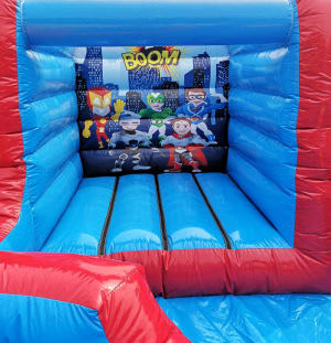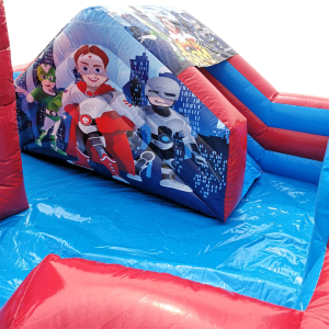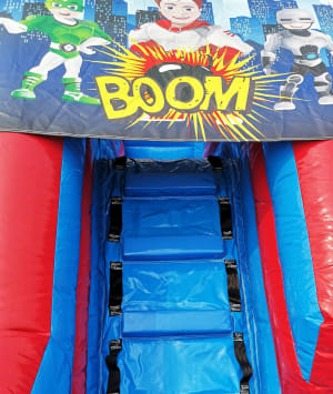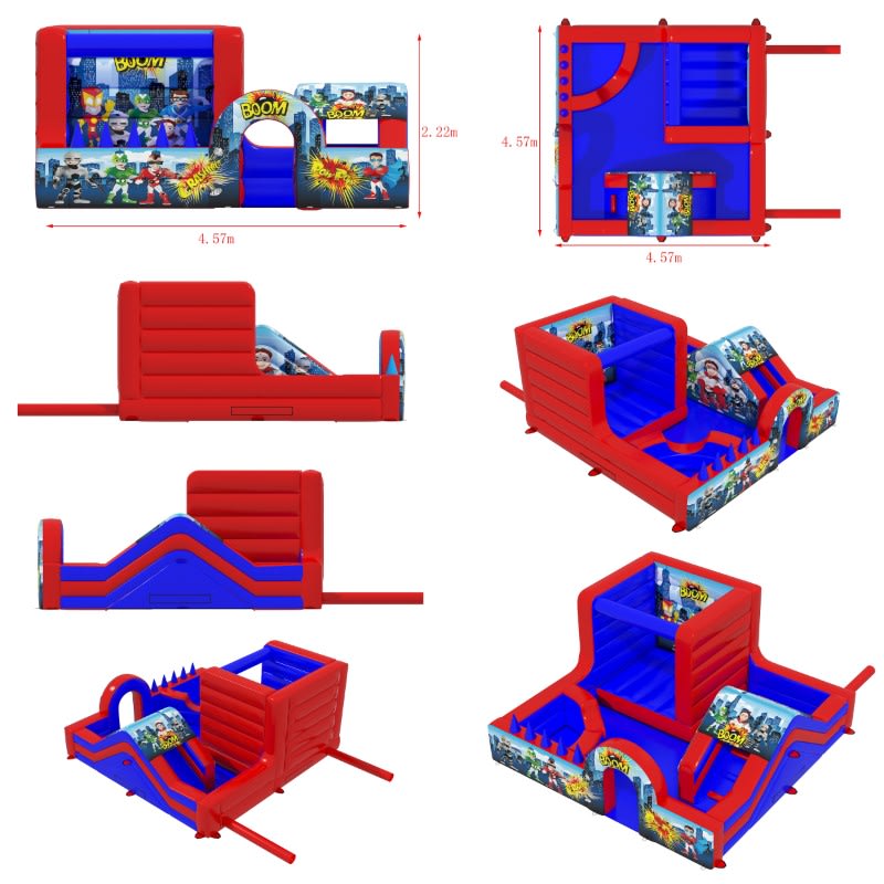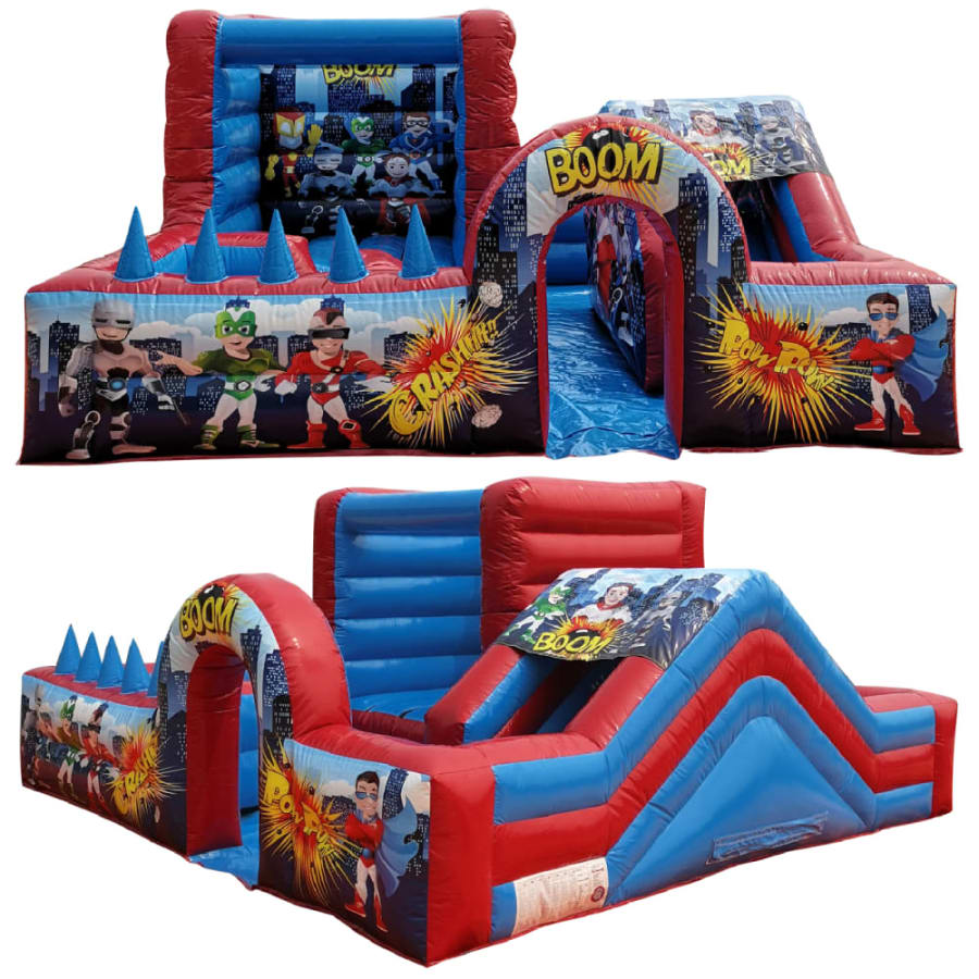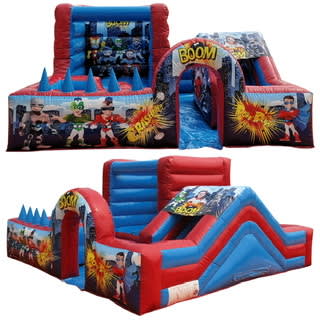 The Heros Play Park comes complete with full size bouncy castle, Ball Pool, sSide, Archway, Air Juggler Cones, Containment Barrier, Fitted Groundsheet, velcro steps and padded slip sheet for extra safety.