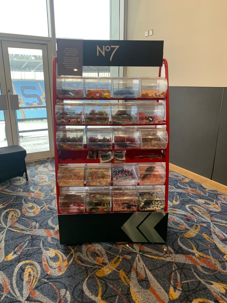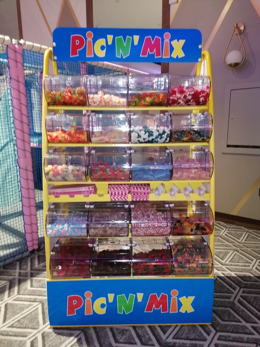 Our pick n mix stand has 20 bins,which holds 2kg in each one that is a total of 40 kg of sweets ideal for any occasion comes with scoops, pick n mix bags and sweets.